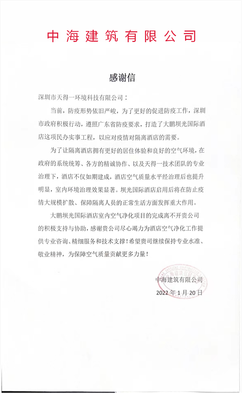 深圳市大鹏新区坝光国际隔离酒店,是深圳市两处管理入境人员的集中隔离场所之一,对我市织密“外严防输入、内严防反弹、严防再输出”防线具有重要作用。在紧张的项目工期内,针对坝光国际隔离酒店存在的苯/甲苯/TVOC超标、异味较大等空气问题,k8凯发(中国)天生赢家一触即发空气治理团队全力为酒店提供室内空气质量保障,进行Tvoc治理、除甲醛、抗菌抗病毒涂层处理、净化设备巩固等治理措施,施工后酒店空气质量提升明显,各项指标均达到标准范围,极大推动了酒店防疫工作的顺利进行。