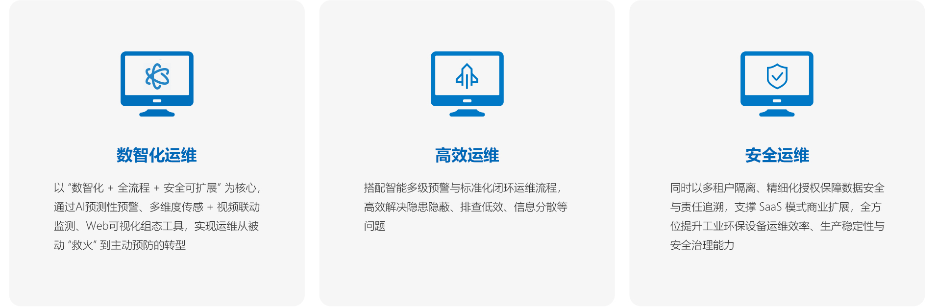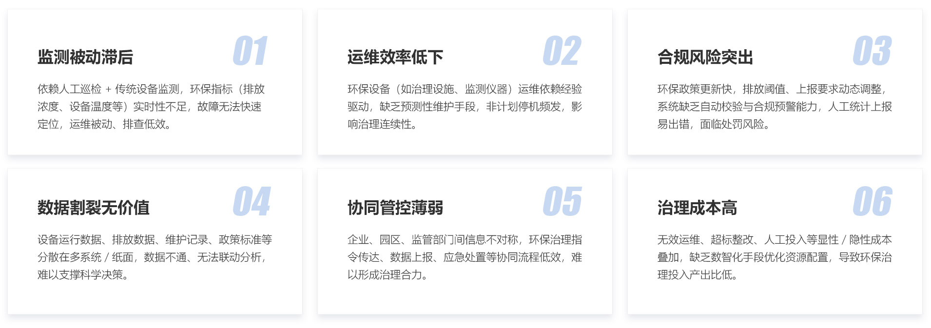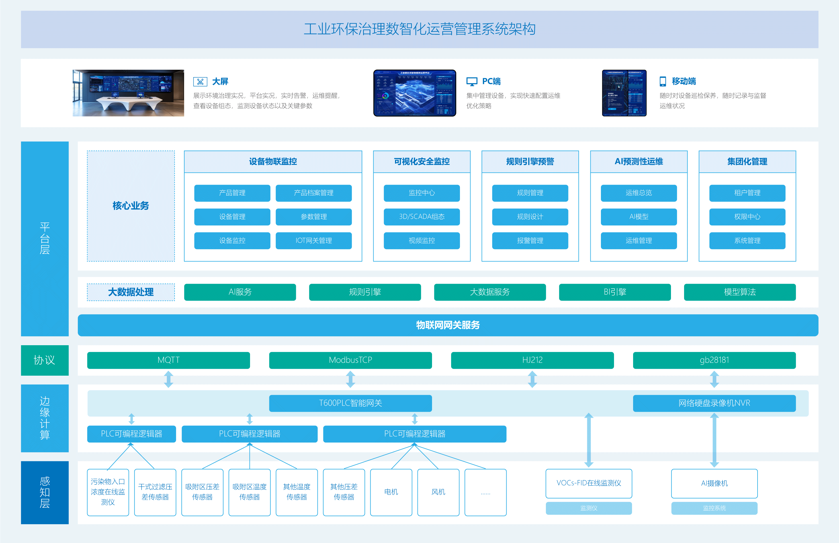 以数智化手段赋能工业环保治理系统运行与维护管理,实现工业企业或园区的环保治理安全、稳定、高效的运行。