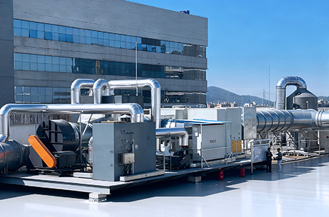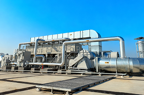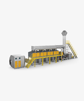 针对此类废气,我司采用“干式过滤+活性炭吸附+催化燃烧(CO)”组合工艺,构建分级净化与再生闭环系统,废气首先经多级干式过滤装置,逐级去除颗粒物,为后端工序提供保护,随后,有机组分在活性炭床层中被高效富集,实现废气持续达标排放。系统核心在于再生环节:当活性炭吸附饱和后,通过热气流对其进行脱附,产生的高浓度有机废气进入催化燃烧炉(CO),在催化剂作用下氧化为CO₂和H₂O,该过程所产生的热能可回用于脱附环节,形成“吸附—脱附—催化—回用”的闭环,在降低系统运行阻力的同时,实现能耗节约与长效稳定运行。